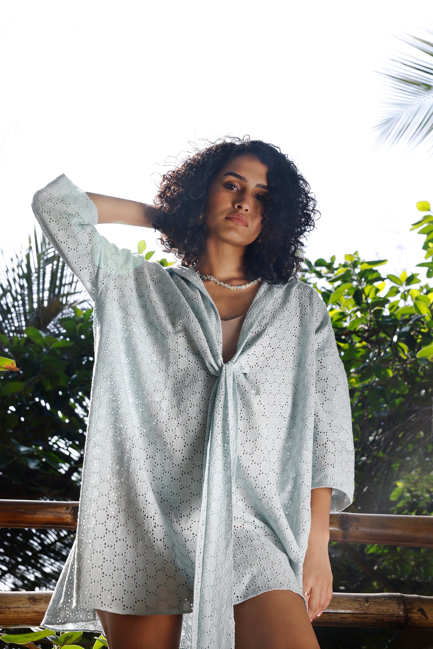 Crafted with natural cotton fabric, this azure broderie tunic dress is a must-have addition for your wardrobe. The intricate broderie design adds a touch of elegance, while the tie up detail and relaxed fit provide a comfortable and flattering silhouette, while the flare sleeves add a chic touch. Perfect for any occasion.